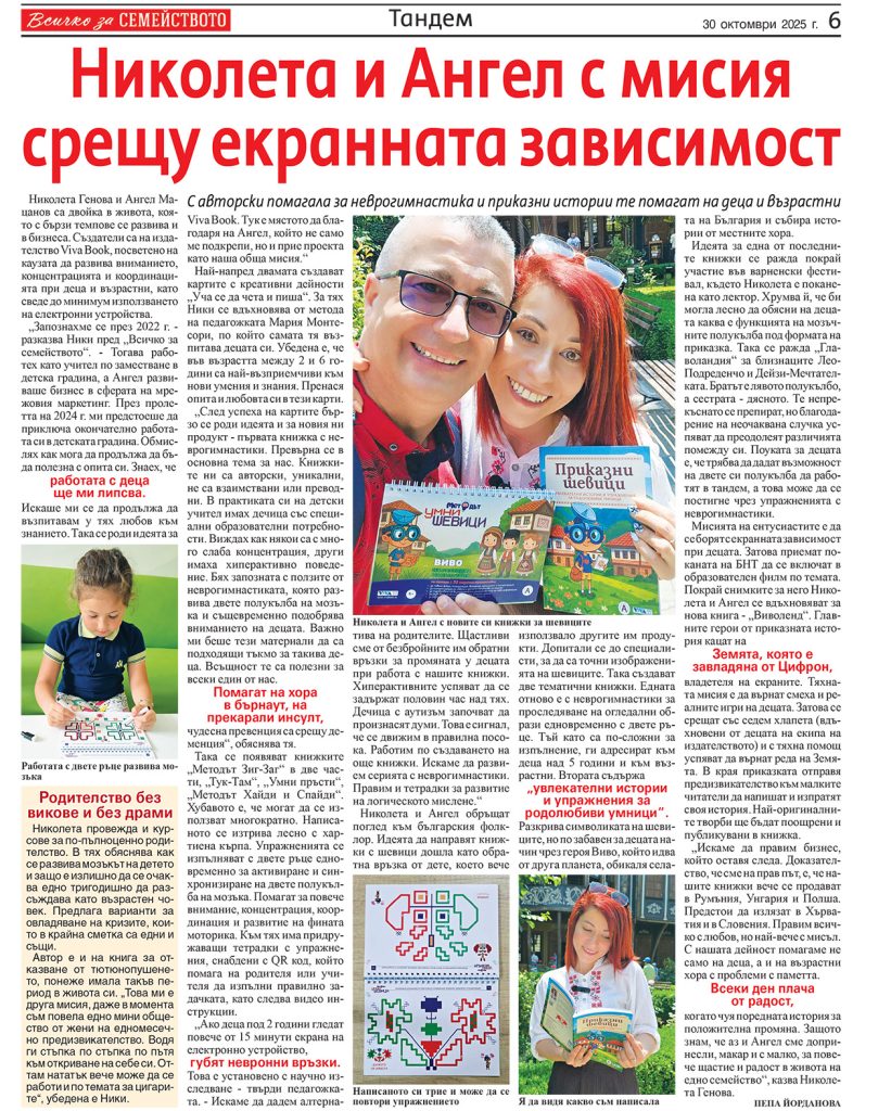 В седмичния брой на вестник „Всичко за семейството“ Николета Генова и Ангел Мацанов споделят как се ражда мисията на Vivabook – да развива вниманието, концентрацията и координацията при деца и възрастни, като сведе до минимум използването на електронни устройства.