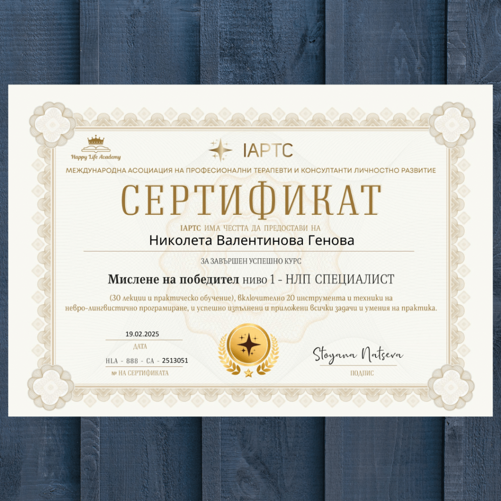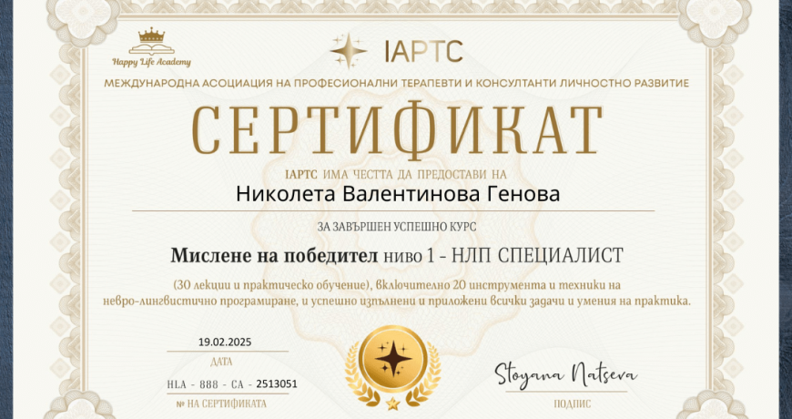 На 19.02.2025 г получих своя сертификат за НЛП СПЕЦИАЛИСТ след успешно завършване на обучението “Мислене на победител” в Академия “Щастлив живот”.