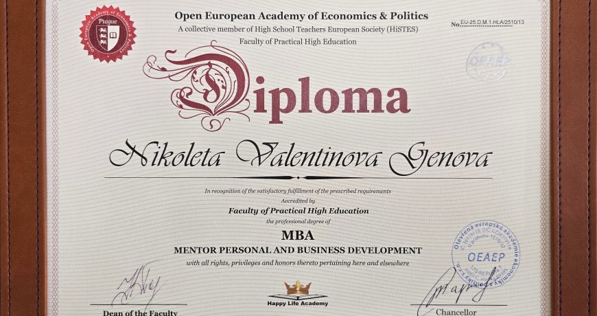 Квалификацията е акредитирана от Open European Academy of Economics & Politics (Прага) и Happy Life Academy. Дипломата е с официално европейско и международно признание, предоставящо пълни права и привилегии за практикуване навсякъде по света.