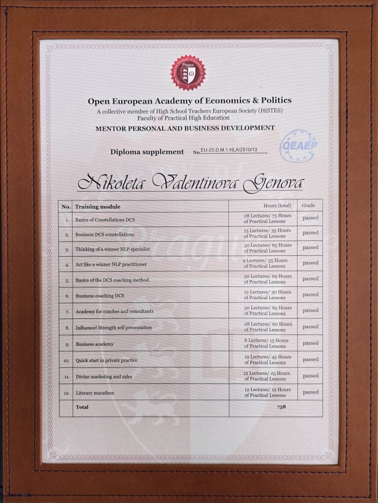 Зад този сертификат стоят над 750 часа специализирани обучения и дълбока практика, обхващащи най-ефективните съвременни инструменти в НЛП (невро-лингвистично програмиране), системните констелации и коучинг подходите.