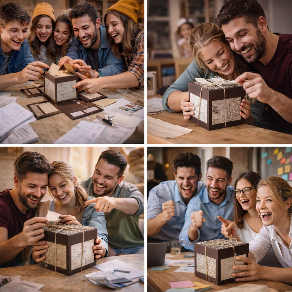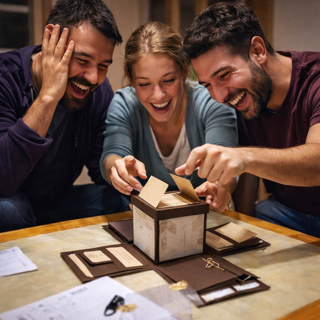 Веднъж решена, мистерията е разкрита… НО! Ако искате да споделите магията с различна компания – приятели, колеги или роднини, определено си струва! Представете си изражението на лицата им, докато се борят със същите предизвикателства, които вие вече сте победили. Освен това, всяка група играчи създава уникална динамика и нови незабравими моменти. Много от нашите клиенти купуват втора кутия именно за да изненадат още от любимите си хора.
