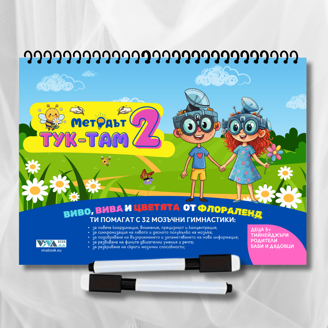 „Методът Тук-Там 2“ е сборник с неврогимнастики, създаден да тренира мозъка чрез едновременното използване на двете ръце и да подпомага развитието на вниманието, паметта и координацията по напълно достъпен и забавен начин.