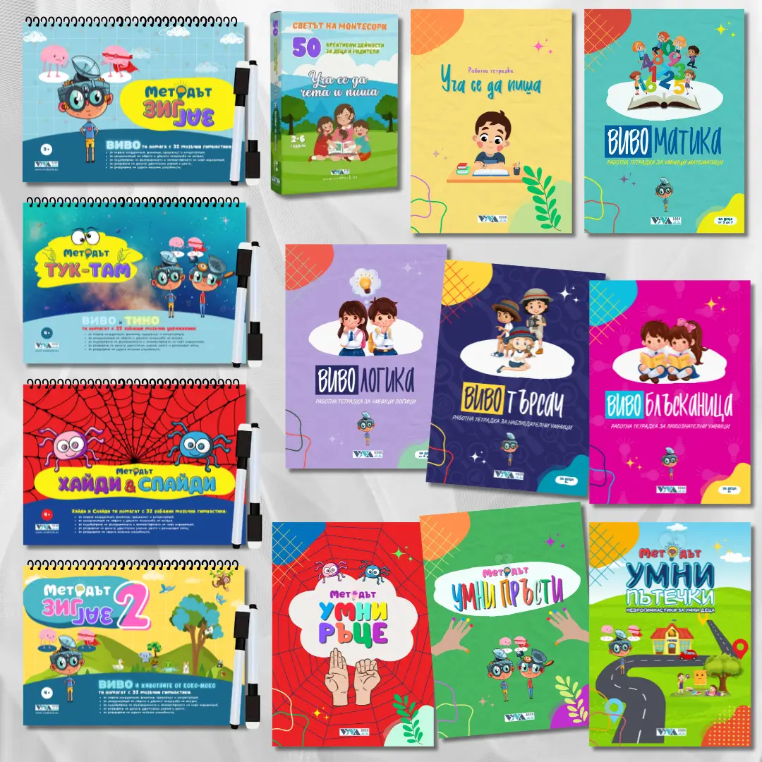 - “Вивотърсач”– работна тетрадка за наблюдателни умници от 4 до 8 годишна възраст – 44 страници с игри и упражнения за деца в предучилищна възраст за наблюдателност, логическо мислене, концентрация и внимание (4 до 8 г);