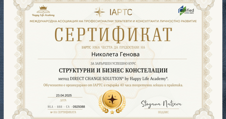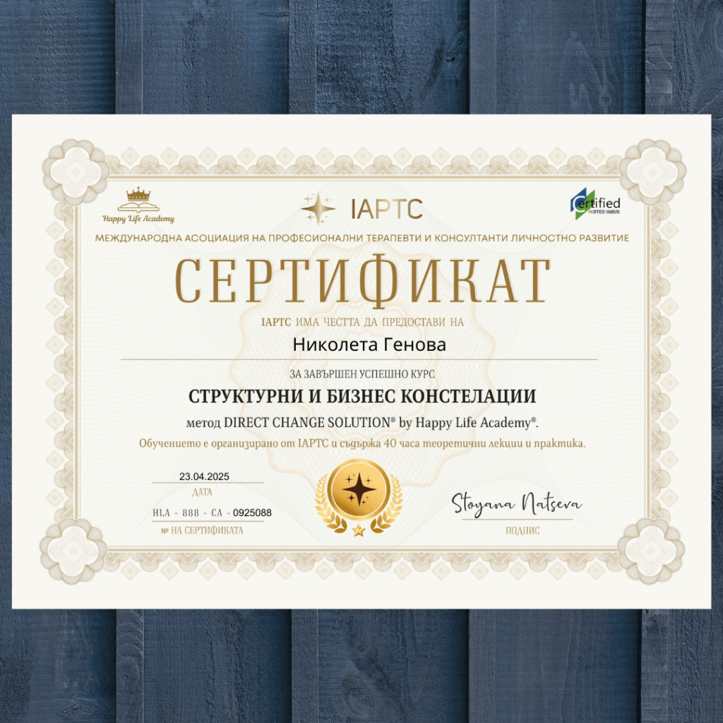 На 23.04.2025 г получих своя сертификат за “Структурни и бизнес констелации” по метода Direct Change Solution от Академия “Щастлив живот”.